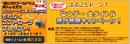 このキャンペーンは,本日から3月31日までの間に50ゴールド(税込525円)でキャンペーン利用権を購入すると,その日から30日間はすべての配信タイトルが遊び放題になるというもの。 さらに,期間中に一度に50ゴールド以上を購入した人にはアンケートページが表示され,アンケートに答えると,USBコントローラが贈られるとのことだ。ただし,コントローラは先着順になっており,数に限りがある(個数は非公開)ため,手に入れたい人は早めにチケットを購入しておく必要があるようだ。