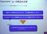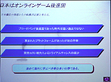 また堀氏は,「MMORPG」という単語についても苦言を呈した。世間一般では「オンラインゲーム=MMORPG」というイメージができあがってしまっている点を指摘し,「それだとオンラインゲームの可能性を狭めてしまうことになりかねない。アーケードの世界ではいち早くオンライン化が進行しているし,コンシューマでもスタンドアロンの補完としてオンライン化が進んでいる。オンラインゲームはもはや特殊な1ジャンルなどではなく,当然あるべき要素になりつつある。オンラインゲームという言葉の定義を,今後もっと押し広げていかなければならないだろう」とコメント。「我々パブリッシャもこの点については反省しなければならないかもしれないが」と苦々しく言いながらも,そろそろ"MMORPG"という単語は役目を終えたのではないか,という見解を語った。