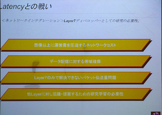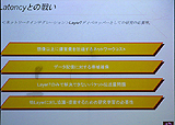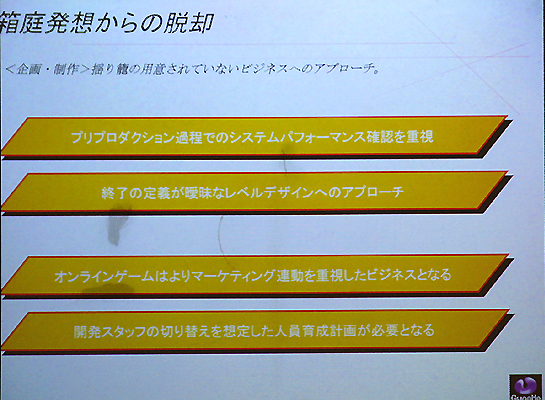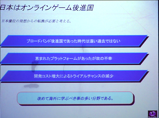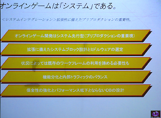 堀氏はまず,具体的な話をする前の前提として「国内のオンラインゲーム開発」の現状認識についての見解を語った。氏が言うには「市場の規模としては年々着実に上昇しており,他国に比べて遜色ないレベルになりつつある。しかしオンラインゲームの開発……要するにデベロップメントという面においては疑問が残る」とのことで,話を要約すると「日本はオンラインゲームの後進国である」ということになる。 その理由として堀氏は,日本がブロードバンド後進国と呼ばれていた時代が遠い過去の話ではないことや,ゲームプラットフォームに恵まれているが故の開発体制の違いなどを挙げている。開発体制がうんぬんというのは,コンシューマゲームの開発が,開発工程の分業化をはじめとしたいわゆる"量産体制"へとシフトしてきているという部分を指摘しており,従来のモデルに則って効率化を求めた結果そういった体制へ移行しているところが,オンラインゲームの開発では不利に働いているという話であった。 またゲーム開発者のソリューションについての知識不足も指摘しており,例えばIBMとHPではサーバーの管理方法が違う,ルーターなどの各種ネットワーク機器について……などなど,堀氏は,オンラインゲームではそういったソリューションの知識も欠かせないものだと説明している。
