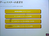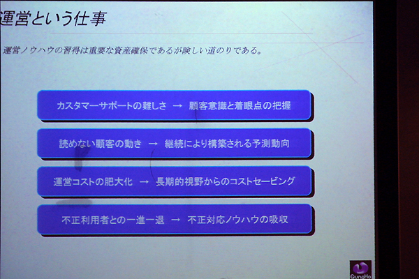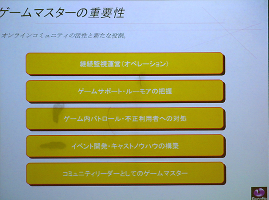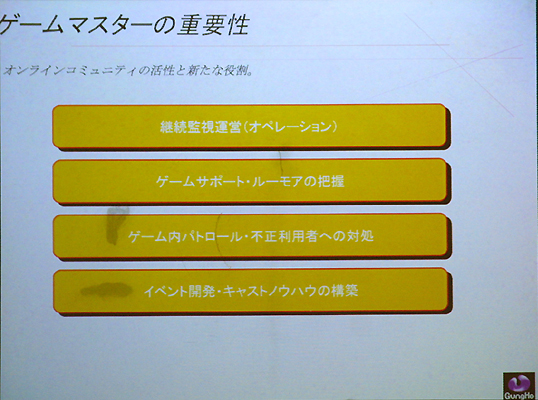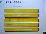 堀氏は,開発に関する論理に加えて,さらにコミュニティ設計やゲームマスターの重要性についても言及。コミュニティ設計に関しては「公園の発想」が重要だと説明し,ガチガチにルールで縛り付けるのではなく,ゲーム内である程度の"余幅"を持たせるべきだとしている。この点に関しては,ラグナロクオンラインの実質上の"作者"であり,現在は「Granado Espada」を開発中のKim, Hakkyu氏も,以前同じようなことを発言している。そういった要素がオンラインゲームの重要なポイントであるという認識が,オンラインゲームデベロッパの間に強く認識されつつあることがうかがえる。 実際の運営やゲームマスターについて,堀氏は「非常に大変」と言い,その説明として「ユーザーが増えていくことは単純に喜べる話ではなく,実はそれだけの人数に対応していかなければいけない辛さも産まれてくる」とコメントしていた点が,非常に印象深い。ここでまたシステム面の話に立ち戻るのだが,同氏は「運営ツールなどについてもよくよく考えなければならない。運営してみないとノウハウをもてないのがつらいところだと思うが,普通のカスタマーサポート的な要素だけではなく,不正への対処などは非常に重要だ」と話し,運営面も見据えたシステム開発を心がけるように促していた。 ゲームマスターの重要性については,上記のようなユーザーへの対応のほかに,堀氏はユーザーをより楽しませるためのイベント開発や,"キャスト"ノウハウの構築を考えるべきだとしている。キャストの説明をするにあたって,堀氏はディズニーランドにおけるミッキーマウスの存在を提示。よりユーザーをゲームの世界に引き込むにあたり,生きたNPCとしての役割も小さくないのではないかとコメントした。