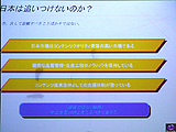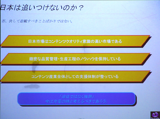 講演の最初でいきなりネガティブワードを連発した堀氏だが,「ただ日本にも優位性はあり,今後十分に盛り返していく余地はある」として,緻密な品質管理体制のノウハウや,アニメや漫画などといった"メディアミックス"戦略がとりやすい点を,日本独自の優位性としてあげた。ご存じの通り,ラグナロクオンラインではアニメや漫画,グッズなど多角的な展開がすでに行われており,いわゆる「ワンソース・マルチユース」戦略の有効性を実証しているガンホーである。そのへんのビジネスロジックについては,ある程度ノウハウが出来ているのだろう。
