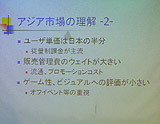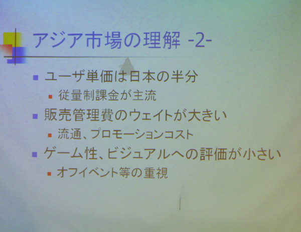 しかしそれでも,アジア市場が魅力的であるのは変わりないと松原氏は言う。松原氏の主張で面白いのが,アジア市場に進出した場合の長所として,ゲーム性やビジュアルで同社のゲームと競合するパブリッシャが少なく,差別化が図りやすいという見解を示していることだ。これは"日本のゲームの特徴を特徴としない"アジア圏の傾向を逆手にとったものである。現地のパートナーとの提携,低コスト流通チャネルの確立,そして土地柄にあったプロモーションを行えば,その特徴が武器に変わるというのだ。 また展開の足がかりとして"現地開発"(子会社による運営と営業,子会社による新作タイトル開発)も重要だとしている。ここでは2月28日に中国での子会社設立を発表したスクウェア・エニックスを引き合いに出し,国内メーカーが同じ認識であることを強調して,論を裏付けている。
