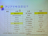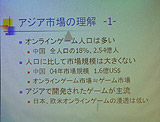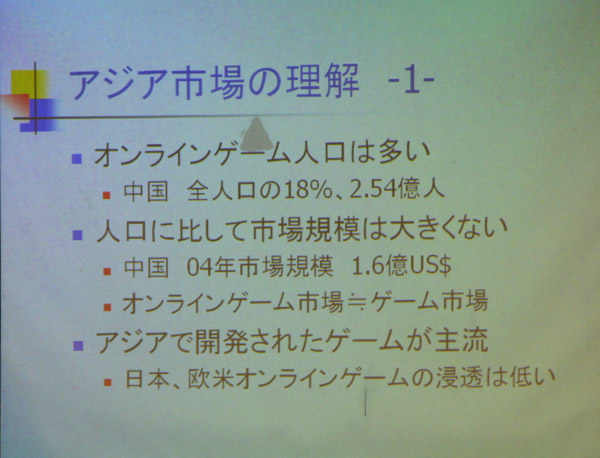 そこで,スクウェア・エニックスのオンラインゲームの売り上げ高が提示されるわけだが,このデータがまた興味深い。 データによると同社の年間売り上げ高は140億となっているが,これを各サービス圏に分けて比較すると,中期の決算で,アジア圏は同社の売り上げの3%しか占めていないことが分かる。携帯コンテンツなどを含めても,せいぜい5%程度だ。 ここで同時に,中国のオンラインゲーム市場が1.6億USドルであるとデータが示される。つまり日本に比べて中国の市場が圧倒的に巨大にも関わらず,スクウェア・エニックスの売り上げの大半は,日本市場に依存しているということ。つまり「市場規模の比率=売り上げの比率」という関係が成り立っていないのだ。 (※)「大航海時代 Online」プレオープンサービス直後にハードウェアのトラブルが発生。徹夜で障害に対応したときに,風邪をひいてノドをやられたとか。