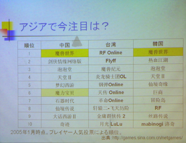 「今日はノドが痛いんです。この理由はあとで説明します(※)」という松原氏の不思議な言葉で始まった,本セッション。 まず氏が取り挙げたのは,意外にもBlizzard EntertainmentのMMORPG「World of Warcraft」(以下,WoW)だった。WoWは,世界的にヒットしたRTS「Warcraft」の世界観を継承したMMORPGである。氏もセッションで語っていたが,WoWの圧倒的なパワーはその"グローバル性"にある。WoWの韓国でのヒットには,MMORPGである点,またベースとなったWarcraftが同国で親しまれている点など,さまざまな成功条件がうまく重なったという背景もあるが,アジアと欧米の両方で成功したという極めて特異なタイトルであることは確かだ。