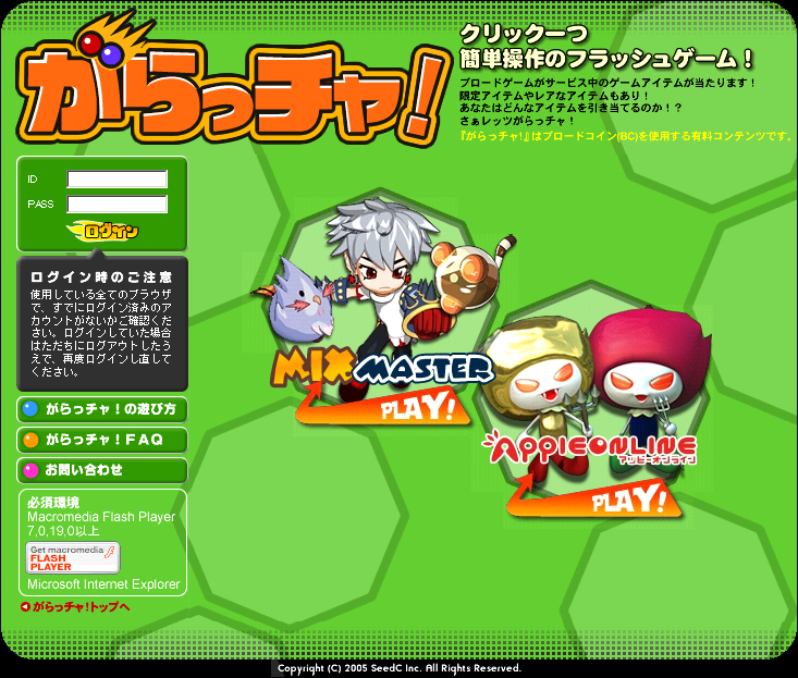 SeedCは本日(3月3日),オンラインゲームポータル「ブロードゲーム」で,「アッピーオンライン」「ミックスマスター」のゲーム内アイテムが当たる有料Flashゲーム「がらっチャ!」「こちら」)のサービスを開始した。