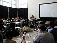 藤本氏(壇上)らが日本のシリアスゲームを説明する間も,真剣にメモを取る欧米の業界関係者達