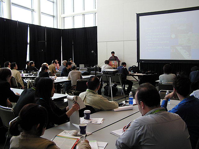 前日に引き続いて行われた「Serious Game」サミットでは,本日は藤本徹氏(Toru Fujimoto/ペンシルベニア大学),新清士氏(Kiyoshi Shin/IDGAジャパン コーディネーター),そして馬場章氏(Akira Baba/東京大学)らによって,日本のシリアスゲームの現状が語られた。 まず藤本氏が,シリアスゲームとしての機能が認められる日本国内の各種エンターテイメントソフトの事例を説明,ナムコが「太鼓の達人」を使って高齢者を対象に行っている"リハビリテーション"活動などを紹介した。 続いて登壇した新氏は,GDCで2002年から2003年にかけて行われていたAcademicサミットをIGDAジャパンが踏襲して,東京大学などとコラボレーションしている事例を挙げ,CEDECでもシリアスゲームを取り上げるセミナーを計画していると,日本側の取り組みを解説した。また,裏付けのない"ゲーム脳"論がメディアで過大に扱われていることを実例に,ゲームに対して批判的な日本の言論状況を紹介したのは興味深い。"ゲーム脳"という言葉を知っている業界関係者は米国では皆無らしく,日本のゲームカルチャーにも後退的な動きがあることを知った参加者は驚いているようだった。 さらに馬場氏は,東京大学のゲーム研究プロジェクトのあらましを説明し,「ゲームと人間」「ゲームと社会」「ゲームと技術」などゲームの多目的利用を研究していることを,ムービーを交えて披露した。
