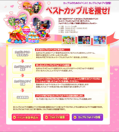 一方,本日開始される予定のホワイトデーイベント「ベストカップルを探せ!」は,カップルが撮影したフォトアイ(アバターを使ったスクリーンショット)を公開して,ユーザーが投票するというもの。期間は本日から3月29日までで,見事入賞したカップルには「往復ペア旅行券」などが贈られるとのことだ。申し込みを終えればすぐにフォトアイはもらえるので,相手がいる人は気軽に参加してみよう。(halen)