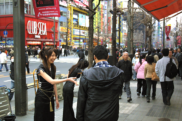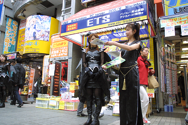 集合写真(?)の後は,いよいよ数派に分かれて街頭に出撃だ。我々も"PRESS"腕章を巻き,広告代理店の方の先導に従い黒服コスプレ隊の後をついて行く。なんというか,どこかのテーマパークに来たパックツアーの客みたいなありさまで,よく知った土地を歩くのは少々きまりが悪かったのだが,こうでもしないと取材にならない事情は,間もなく明らかになる。 中央通り沿いの展開予定地点で,マビノギガールズの面々は3〜5人のグループに散開してグッズの配布を開始する。配ったのはチラシの入ったマビノギクリアファイルだ。こちらはその情景を写真に収めるわけだが,ものの10〜20分で用意してきたクリアファイルを撃ち尽くして戦闘終了である。したがって,我々の取材もこれで終わり。確かに随行取材でもしない限り,肝心の場面に出会えない可能性が大きい。