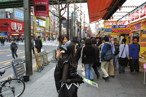 写真中,右:街頭で活躍するマビノギガールズの面々。だが,これらの写真からも分かるように,当日は曇天で肌寒かったこともあって,黒っぽい服の人も多く,存外目立たなかったのが残念なところ。まあでも,今のアキバでどんな格好をしたら目立つのかというのも問題だ
