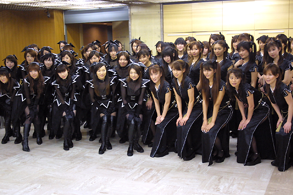 さて,正午を挟んで13時15分からは,マビノギガールズ秋葉原ジャックである。ワシントンホテルの隣にある,労働省秋葉原庁舎2階がこのイベントのヘッドクォーターとなっており,まずは集結を完了したマビノギガールズ50名の洗礼を受ける。 ……黒い。とにかく黒い。いや何かの比喩ではなく,両キャラクターとも衣装が衣装なため,本当に黒づくめの集団なのだ。ファンタジーストラテジーゲームの中で閲兵式をやったらこんな感じだろうかと想像してしまう。いや,MMORPGなんですが。ナオ役のみなさんのなかには,髪型をきちんとツインテールにして扮装を凝らしている人もいたが,さすがに髪を白っぽく染めている人はいなかった。そりゃ黒くもなる。 このヘッドクォーター,50名が準備/待機するには十分な面積なのだが,いかんせん奥行きがあまり取れない。よって,写真を撮ると,もれなく一面の黒服軍団。その威容をしばし堪能されたい。