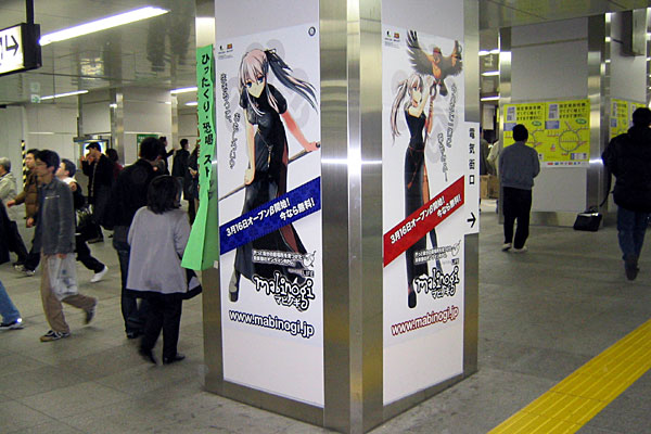 写真中:「JR秋葉原構内の柱に貼られた,マビノギのポスター。面によってバージョンの違うものが使われているなど,気合のほどが窺われる(撮影:Guevarista)