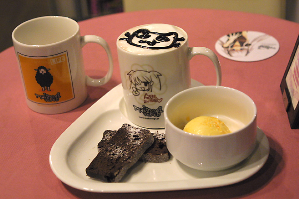 そうこうするうちに,1日5食限定で1000円也のマビノギタイアップメニューが運ばれてくる。いや,撮影用であって試食したりはしてないわけだが。チョコレートケーキとシャーベット,オリジナルマグカップに入ったラテ付きアイスチョコがその内訳で,ラテの泡の上には,開発元devCATのトレードマークであるネコの顔がチョコレートソースでデコレートされる。あまり時間が経つとチョコレートソースが沈んでしまうということで,慌しく撮影開始。ちなみに2種類用意されたオリジナルマグカップは,帰りに洗ってお客さんに持たせてくれるらしい。