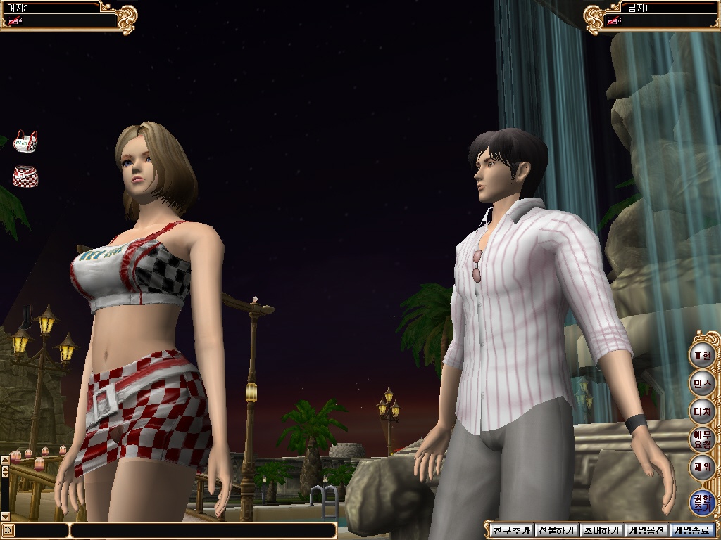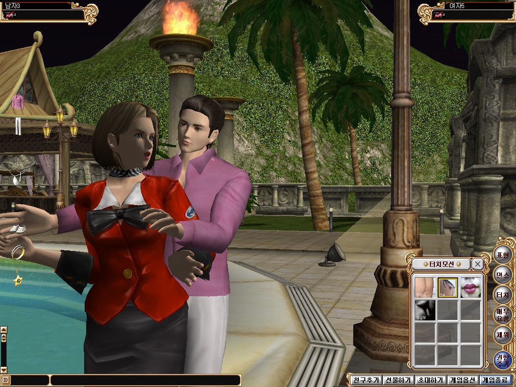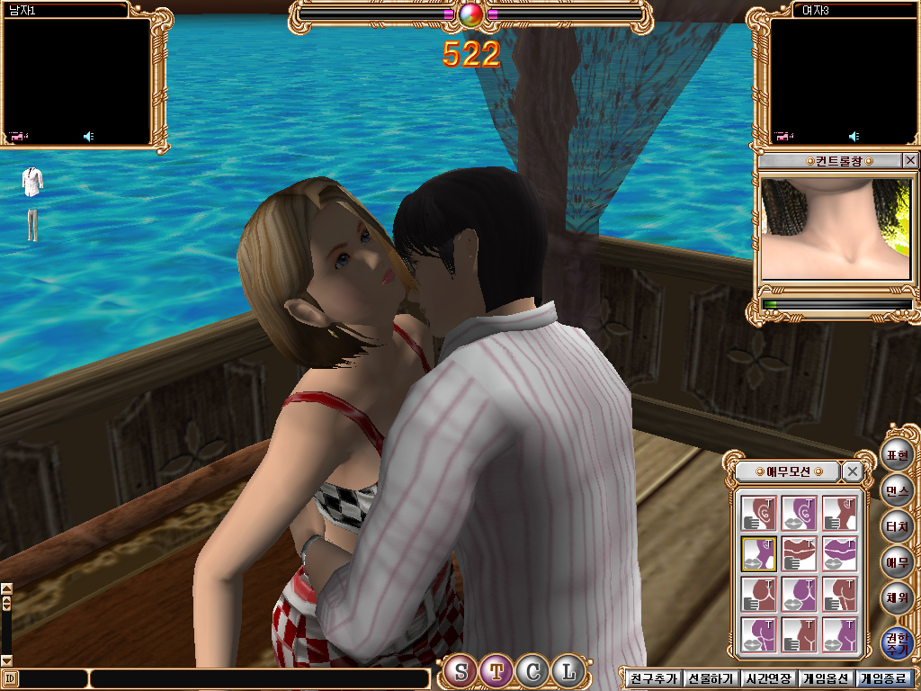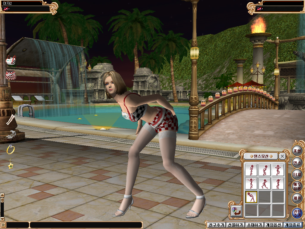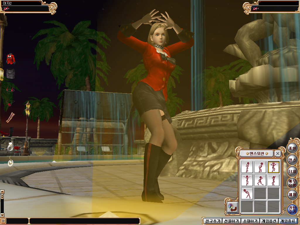 6・ゲームスタート ゲームが始まると,MMORPGと同様に,プレイヤーはマップ内のあちらこちらを移動できる。そしてそのルームに異性キャラクターが入ってくれば,まずは挨拶などの一般的なモーションやチャットで,コミュニケーションを図る。 ちなみに,相手を誘惑するためのセクシーなダンスモーションが用意されているうえ,そのダンス用のサウンドを選択することもできるようだ。