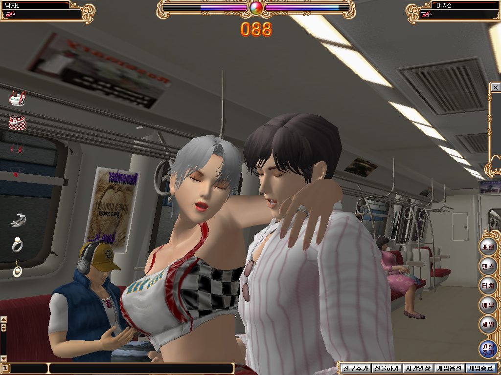 7・タッチモード ある程度意気投合すれば,次の段階に進む。具体的には,相手の体に"タッチ"して,反応をうかがうわけだ。タッチされた側は,モーションやチャットで,相手に自分の感情を表す。 なお"タッチ"は,当然のことながら,二人のキャラクターが至近距離にある状態でのみ可能だ。