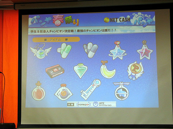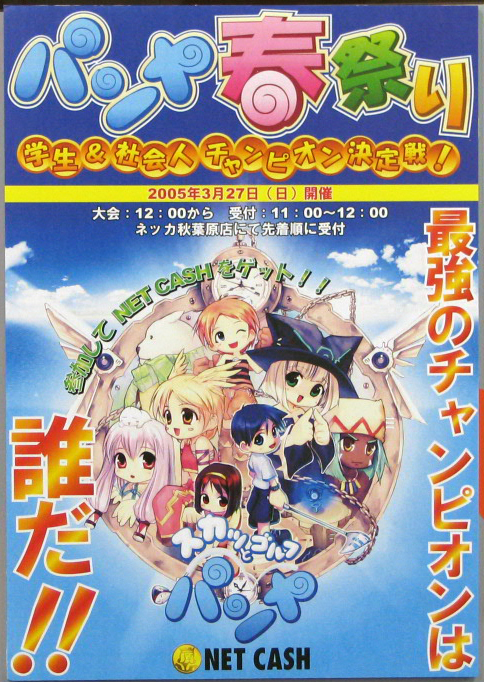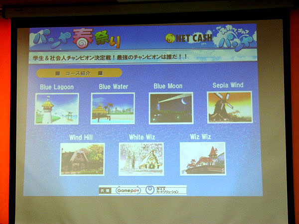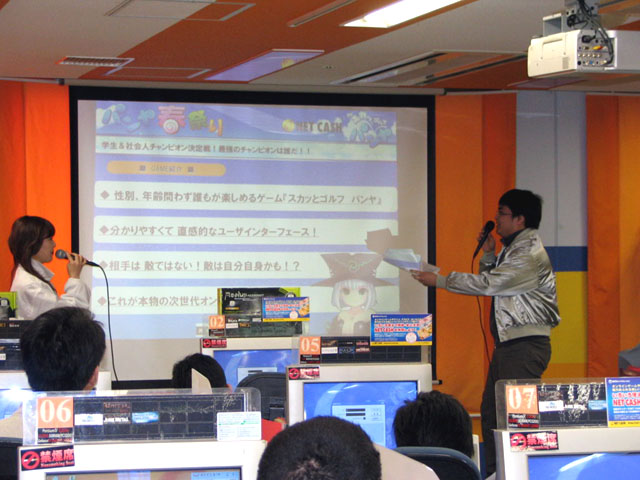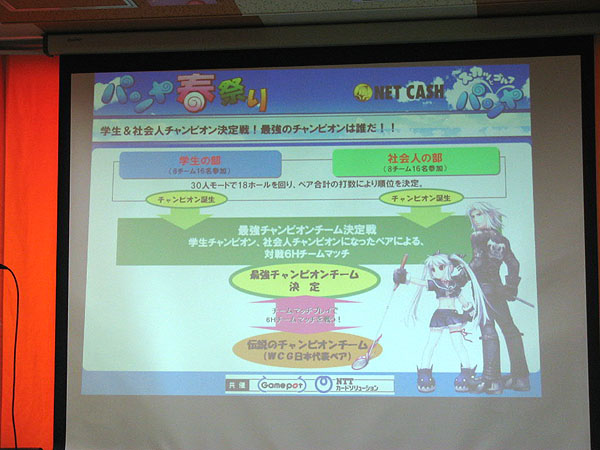 「スカッとゴルフ パンヤ」を運営するゲームポットは2005年3月27日,東京は秋葉原のネッカで「パンヤ春祭り 学生&社会人チャンピオン決定戦 最強のチャンピオンは誰だ!!」を開催した。 このイベントはパンヤを使ったゲーム大会で,二人一組でペアを組んで"学生の部"と"社会人の部"ごとの1位を決め,その後1位同士で戦い,最終的なチャンピオンを決定するというもの。さらに優勝チームは2004年のWorld Cyber Games 2004の日本代表チームと戦うので,事実上の最強決定戦といってもいいだろう。 ちなみにこの手のイベントというと,開演ギリギリに参加者/観戦者がどっと押し寄せるパターンが多いが,本大会では多くの参加者希望者がイベント開催前から会場に集まっており,大会にかける意気込みの高さが感じられた。