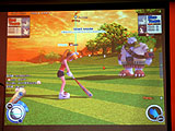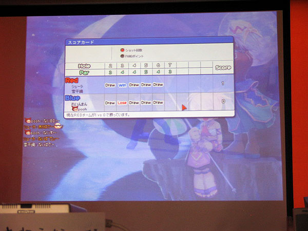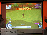 なかなか興味深い試合で,第一打でシュウ鍋チームはいきなり勝負とばかり,水切りショットを狙ったが池ポチャになってしまった。いきなり有利になったWCGチームだったが,ここで刻んで手堅く勝利を取ることをプライドが許さないと,同じように水切りショットを狙って失敗。会場は笑いに包まれた。 1ホールめはドロー,2ホールめでシュウ鍋チームが先取すると,3ホール,4ホール,5ホールともにドローとなり,勝負は最終ホールへ。だが最終ホールがショートホールだったため,WCG2004日本代表チームが逆転するにはホールインワンしかない状況になってしまった。モニターに注目する多く観戦者からは,ホールインワンを期待する声が。……すると,なんと本当にホールインワンが飛び出してしまったのだ。だがホールインワンしたのは,WCG2004日本代表チームではなく,シュウ鍋チームであった。 こうしてシュウ鍋チームが堂々の勝利を飾り,エキシビジョンマッチは終了した。WCG2004日本代表チームのpooh氏は試合後に,「最終ホールでホールインワンを取るのは我々だったのに,何しないうちに負けちゃいました。途中まではシナリオ通りだったのになぁ」とコメントして笑いを誘っていた。