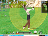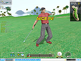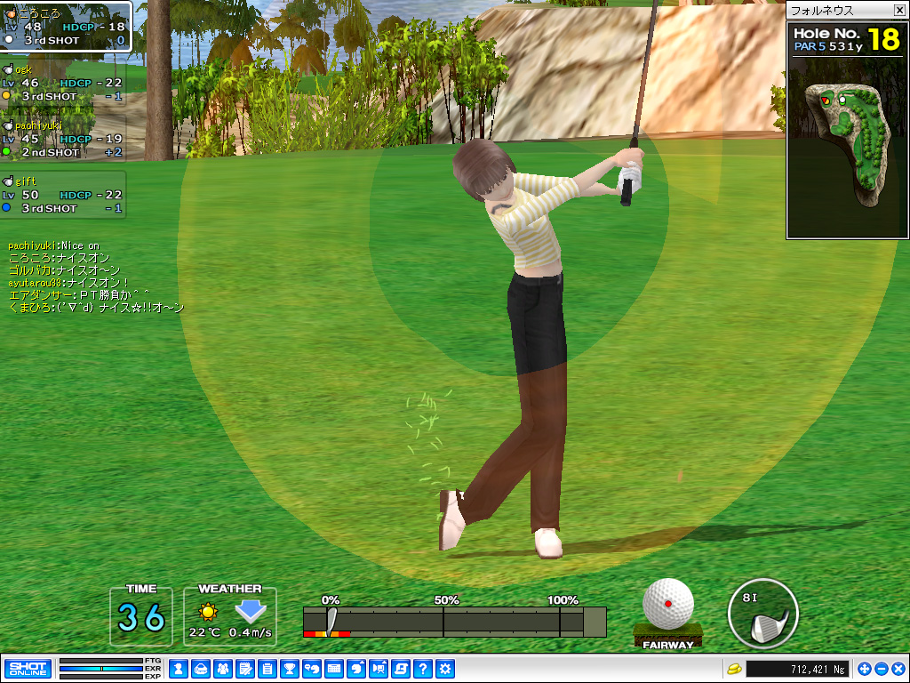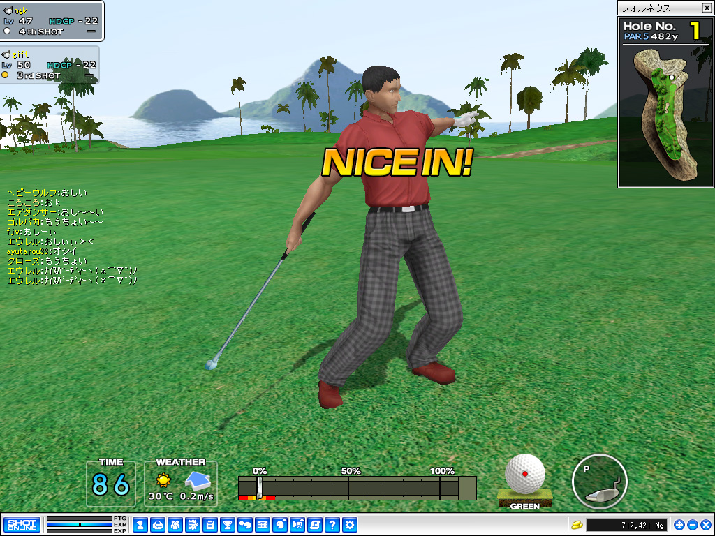 マッチプレイで最初に1Upでもしたほうが勝者という,サドンデスの延長決勝戦は,17時2分からスタート。ゲーム中のラグが心配されるほどオンラインギャラリーも殺到し,まさに頂上対決となった。No.1ホールで行われた最初の勝負,セカンドショットでグリーンをオーバーしてしまったogk氏に対してgift氏は2オンを決め,早くも勝負あったかと思いきや,3打めでogk氏がチップインぎりぎりのアプローチを放ち会場内は騒然。結局,gift氏はロングパットを外してしまい,両者ともバーディで次ホールへ。 お次は本日3度めとなる,No.5ホールでの勝負。ショートホールで両者とも長考の後1オン,gift氏がミドルのパットを打つが,これが実に惜しいところでカップをそれてしまう。言葉にできない緊張の中,ogk氏が2打めで見事ボールをカップに沈め,会場は盛大な拍手に包まれた。