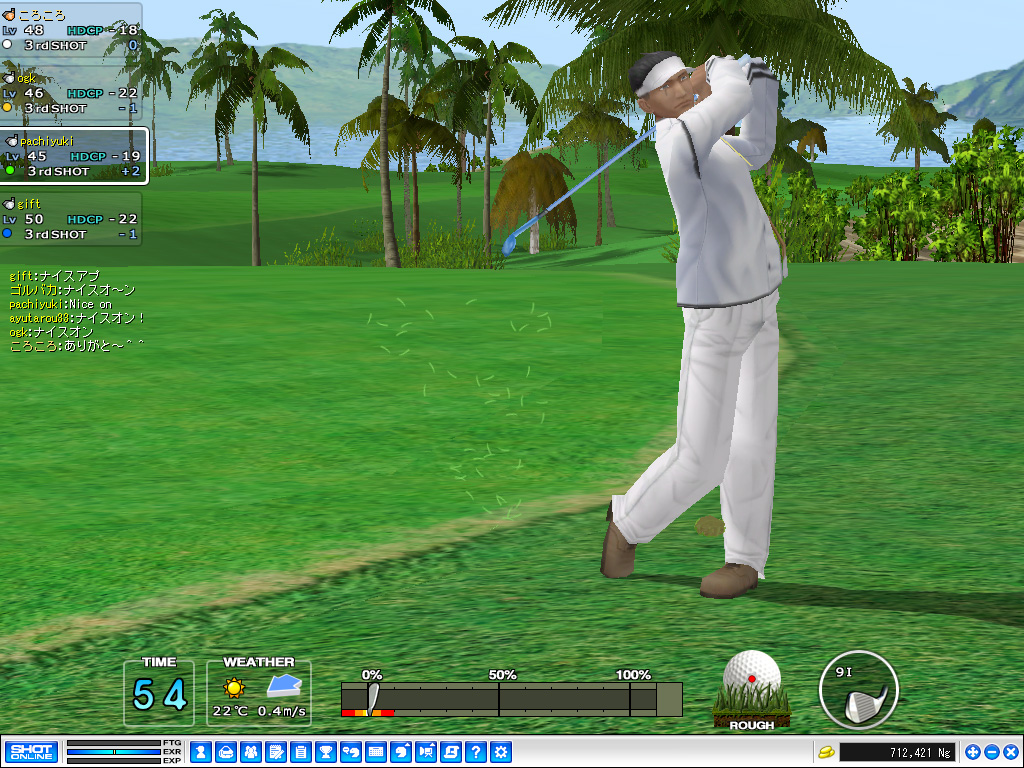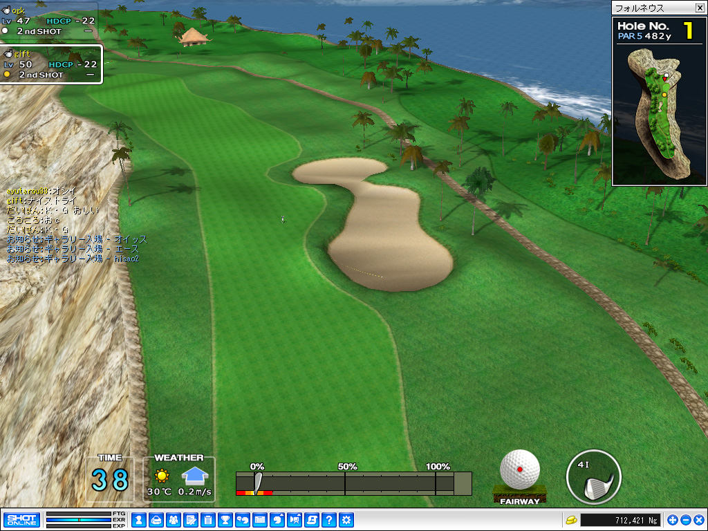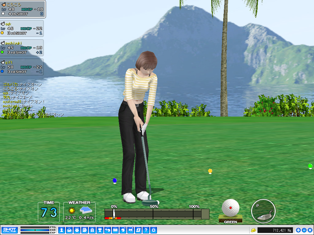 4名とも実にハイレベルな安定感があり,4ホールめでウォーターハザードを出しダブルボギーを叩いてしまったpachiyuki氏も,そこから崩れることはなく,最終ホールまで食らいついていく。6ホールすべてをパーで回ったころころ氏も,安定感は相当なものである。 しかしgift,ogk両氏の実力がジワジワと結果に現れ始め,