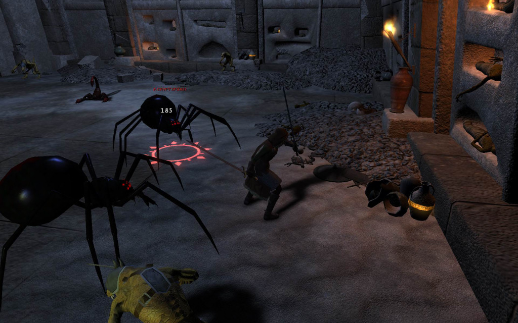 たった1点だけの公開とはいえ,プレイヤーキャラクターとおぼしき人物が,地下墓所のような場所で"Crypt Spider"という巨大なクモのモンスターと戦っているという,実に興味深い内容。またプレイヤーキャラクターはロングソードの二刀流で,画面奥にはサソリ風のモンスターがいるし,ほかにも周りにはリザードマンを思わせる二足歩行タイプの爬虫類系のモンスターが映っているなど,見どころも多いといえるだろう。