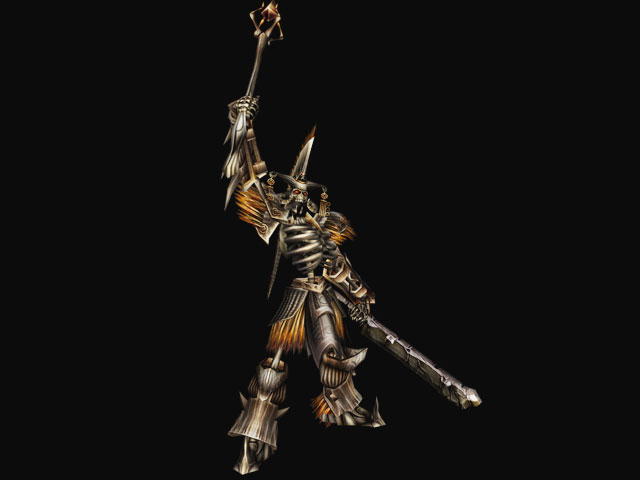 陰鬱な雰囲気漂うベルグラドの森(左)。毒蜂と人の合成生物であるメリータ(中央),武器を両手に構える骸骨戦士ケイモス(右)