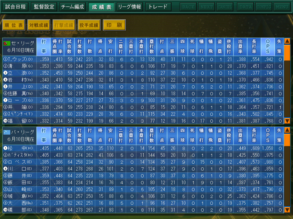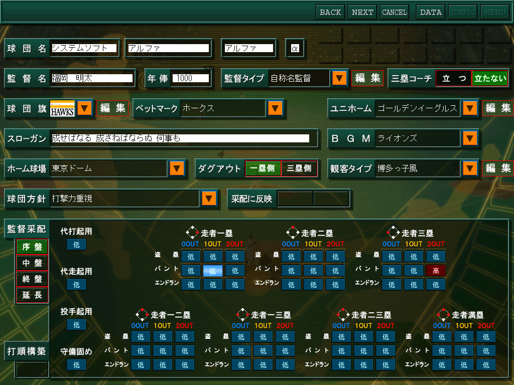 前作が備えていた「監督采配」など思考ルーチンの編集機能にも,新たな項目が追加される。選手を特定の打順に固定する「打順オーダーの固定機能」,ミート力や走力といった各能力で打順組替を判断する「打順構築エディット機能」などがそれだ。また,「球団方針」を「長打力重視」や「機動力重視」などと設定することで,「監督采配」と「打順構築」がその方針に沿った内容に自動で変更されるなど,プレイヤーが戦略の立案により専念できるようになる。 各選手について確認可能な成績項目も拡充され,打者の成績としてはメジャーリーグで用いられる出塁率+長打率指標OPS(On-base Plus Slugging),投手成績にも"被出塁率"と"被長打率"が追加される。