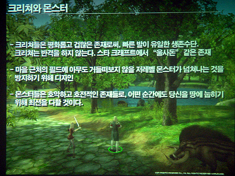 GEの"モンスター"は,ほかのゲームと同様,実にどう猛な存在だが,"クリーチャー"はちょっと違う。彼らは臆病で穏やかな性質を持ち,プレイヤーキャラクターが攻撃しても反撃してこない。クリーチャーの武器は,ただ速い"逃げ足"のみ。 このクリーチャー達の存在についてキム・ハッキュ氏は,「従来のMMORPGでは,最初の町の周辺には低レベルのモンスターがたくさんいた。しかし,それこそプレイを始めたばかりの人以外には,このモンスター達はまったく無意味な存在だった」と語る。つまり,このクリーチャー達には,キム・ハッキュ氏ならではの哲学が込められているといえそうだ。
