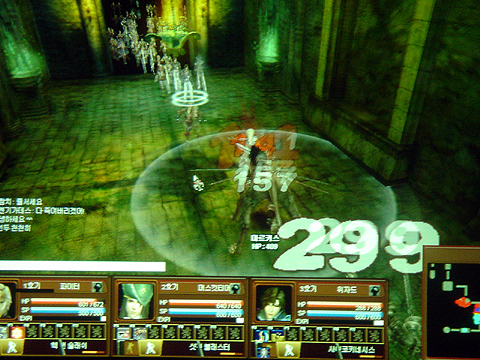 17〜18世紀のヨーロッパの街並み(時代考証もしっかり行われたそうだ)を思わせるマップ,美麗なフィールド,そして自然環境(木の葉,草など細部まで!)がリアルに再現されている。ムービーでは,村内の噴水広場,シナリオ上の重要な存在である"エスパダ"の銅像が立つ街の大門も見られた。また,フィールドに落ちている"アイテム"からは白い光の柱のエフェクトが出ており,すぐに認識できるようプレイヤーの便宜が図られていた。 これらグラフィックスは,互換性を考慮して,ピクセルシェード機能を使わずに描いたものなので,古いビデオカードを搭載したPCでも,高いクオリティの映像を堪能できるようだ。 ダンジョンで行われた戦闘では,15人のプレイヤーからなるMCCチームメンバー(つまり総勢45人のキャラクター)が,剣や魔法スキルを使って豪快な連続攻撃を繰り出していた。攻撃されたモンスターが後方へ飛んで倒れる姿は,まるで格闘ゲームのようだった。