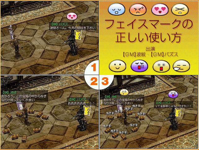 ■フェイスマーク祭り2005〜叩いて叩いてじゃんけんダイスき〜 開催期間:4月26日〜5月10日 内容:イベント期間中に"エモティコモンスター"が発生。倒すと,特別なアイテムをドロップする。またじゃんけんやサイコロなどの遊びアイテム,ほか可愛らしいフェイスマークがたくさん登場