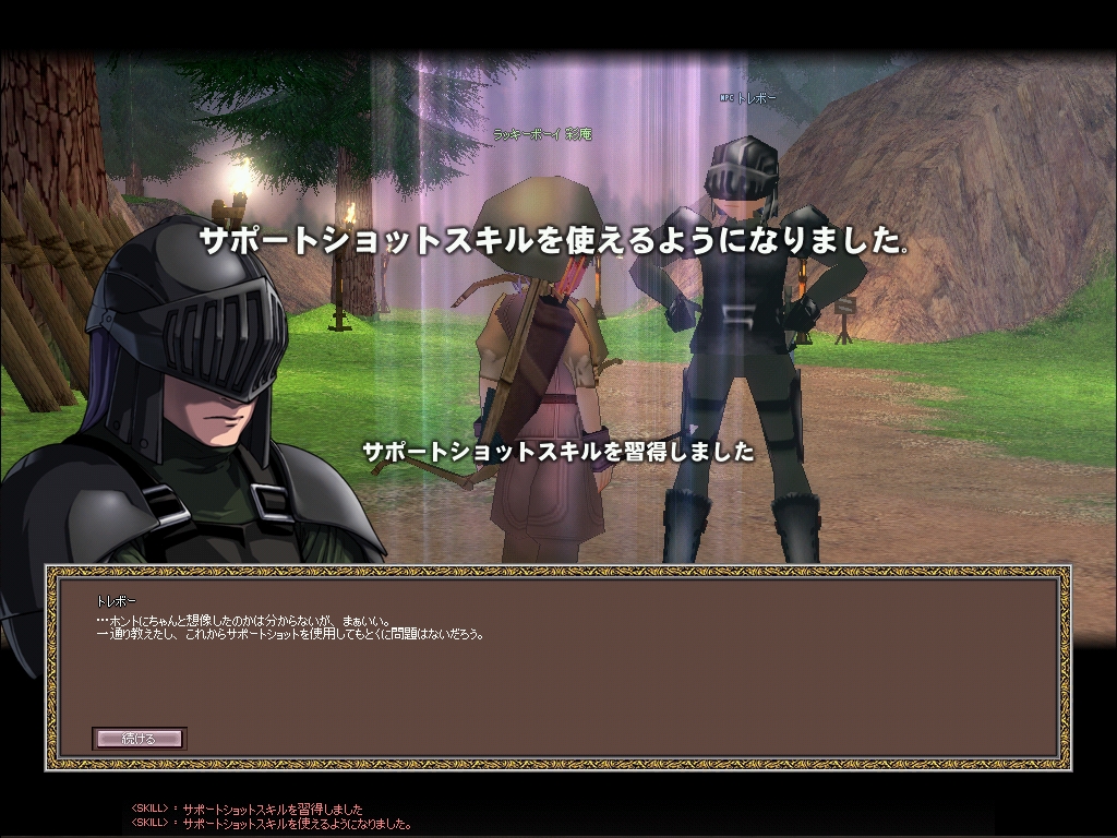 また,26日の正式サービス開始とともに,「釣り」と「サポートショット」という二つのスキルが実装される点も見逃せない。 釣りは,雑貨屋で売られている"釣り竿"を購入,装備することで習得できる。"エサ箱"をセットで装備すれば,貯水池や川で魚釣りが楽しめ,魚だけではなく,ごくマレに高価なアイテムが釣れることもあるらしい。 サポートショットは,ティルコネイル北にいるトレボーが教えてくれる,弓のスキル。前衛が交戦中のモンスターに対し,戦闘のリズムを崩すことなく援護射撃できるスキルなので,弓を扱う人ならぜひ覚えておきたいところだ。(大路政志)