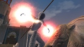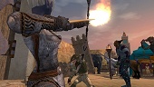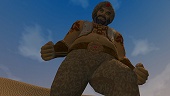 さて,モンクが崖を登りきってしばらく歩いていると,突然背後にSand Giantが出現。このSand GiantはDoFでは,genies(精霊),sphinx(スフィンクス),mummies(ミイラ),harpies(ハルピュイア)など40種以上のモンスターが追加される予定で,プレイヤーはオリエント世界のイメージで冒険できそうだ。 さて,ムービーはモンクがSand Giantから魔法の絨毯を奪って逃走するというシーンに突入する。このシーンでは空を自由に飛んでいるようだが,グリフォンのような固定ポイント間の移動のシーンと思われる。