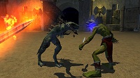 ノームは逃げるもののゲートに追い詰められてしまうが,そこに現れたのはモンクとダークエルフ,そしてガーディアンウィザードの3人。ガーディアンの魔法がEvil種族にヒットし,画面がホワイトアウトすると,シーンは屋内へ。実は,ここがDoFのメイン要素となるPvPアリーナ(施設はMaj'Dul内にある模様)となる。Arena Championでは,自分自身を操作して戦うだけでなく,モンスターに変身して戦えるのがユニーク。現在公開されている情報から類推すると,変身できるモンスターは登録制でコレクション要素があるようだ。どのような形でモンスターに変身できる"権利"を得るかが気になるところだが,ここは追って発表がなされるだろう。