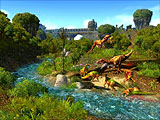 ParaWorldはキャンペーン制になっており,15種類のマップは森林,ジャングル,サバンナ,雪原,火山の五つの地域をモチーフにしている。動物ユニット50種のうち,40種類が恐竜,10種類が氷河期の巨大哺乳類となっていて,デモを見ただけでもラプター,ステゴサウルス,トリケラトプス,ティラノサウルス,ブラキオサウルス,そしてマンモスや毛サイなど,実にバラエティ豊かだ。 これらの動物はParaWorldでは資源として捉えられており,本来は野生としてマップ上に点在している恐竜やマンモス達を,文明の発達によって捕獲する技術を身につけ,それを手懐けて戦闘用に調教したり繁殖させたりしていくのである。