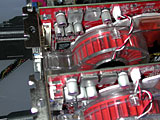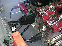 動作中のCrossFire。微妙に形状の異なるCrossFire対応カードと,既存のASUSTeK製RADEON X850 XT搭載カードが,専用DVIケーブルでつながっている