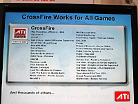 CrossFire対応版Extreme AX850XT/2DHTV(正式名称未定)の価格は500ドル前後になる見込みで,電源ユニットは450Wクラス以上が推奨されるとのこと。越えるべきハードルはとくに価格面で高いが,すでに「Tom Clancy's Splinter Cell:Pandora Tomorrow」や「The Matrix Online」,「Counter Strike:Source」,「FINAL FANTASY XI」など,30本を超えるタイトルがCrossFireへの対応を表明しているのは魅力といえる。次世代ビデオチップの声がまだあまり聞こえてこないATI Technologiesではあるが,とりあえずRADEON X850/800シリーズのユーザーは要注目だ。(佐々山薫郁)