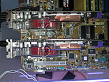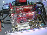 今回ASUSTeK Computer(以下,ASUSTeK)が展示していたのは,RADEON XPRESS 200 CrossFireを搭載した,同社のマザーボード新製品「P5RD2-MV2 Deluxe」に,RADEON X850 XT CrossFire Edition対応版「Extreme AX850XT/2DHTV」と,既存のExtreme AX850XT/2DHTVを組み合わせた構成だ。注目したいのは,それぞれ2ポートずつ用意されたRADEON X850 XT搭載カードのうち,2枚め(既存のRADEON X850 XT搭載カード)の片方と,CrossFire対応カードの片方,それぞれのDVIコネクタ同士を専用のDVIケーブルで接続している点だ。ケーブルはそのままCrossFire対応版からディスプレイへと伸びる仕様になっているので100%同じではないが,往年のVoodoo SLIを彷彿とさせる。