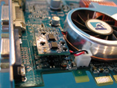 写真右:実際にグラフィックスカードに取り付けたところ。ちなみに同社ではこの機構を「BIOS 4WD」と名付けている。なぜ4WDなのかは「分からない」(Tomasz Swatowski氏)そうだ