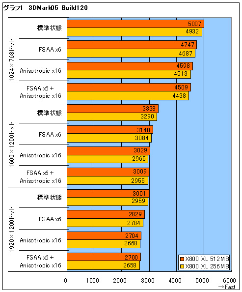 さて,グラフ1は,「3DMark05 Build120」における結果だ。 全体として,X800 XL 512MBがX800 XL 256MBよりもわずかながら性能が高い。1920×1200ドットでは40前後,1024×768ドットでは70前後の差と,若干違いはあるものの,いずれもパーセンテージ換算で1.5%程度。つまり,解像度やエフェクトにかかわらず,X800 XL 512MBがX800 XL 256MBよりも1.5%ほどスコアがいいわけだ。これは「グラフィックスメモリ容量が増えたから」というよりはむしろ,新しいカードデザインでグラフィックスメモリ周りの配線がグラフィックスメモリ512MBに最適化された結果と見るのが妥当だろう。