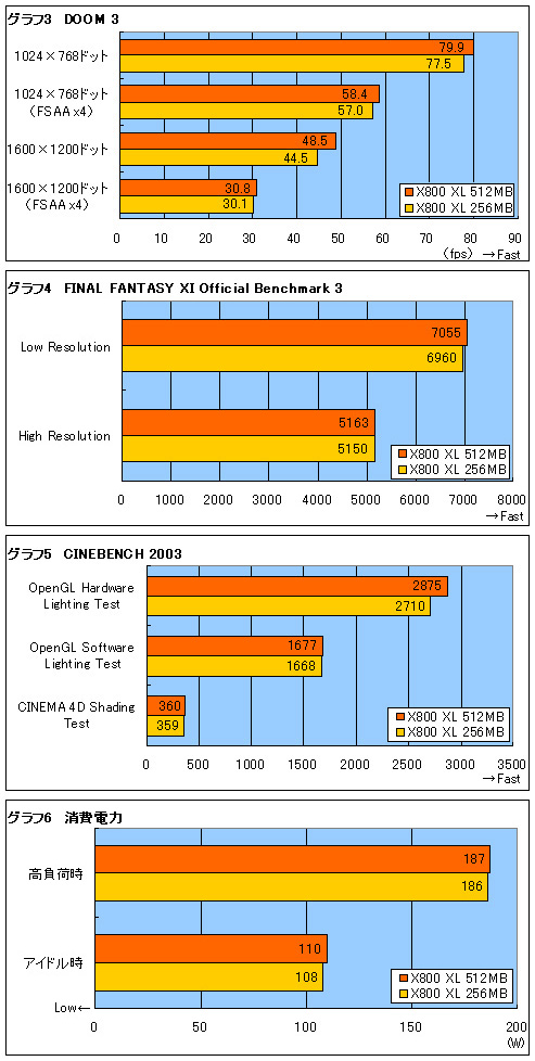 次に「DOOM 3」を見ていこう。ここでは,FSAAをかけていない標準状態で比較して,1024×768ドットでは2.4fps,1600×1200ドットでは4.0fpsの差がついている(グラフ3)。パーセンテージ換算では順に約3%,約8%で,DOOM 3においては高解像度においてグラフィックスメモリ512MBの恩恵が明確といっていい。 一方,「FINAL FANTASY XI Official Benchmark 3」では,解像度に関係なく相対的に512MB版のほうが高い数値を示している(グラフ4)。これは3DMark05のところで述べたように,X800 XL 512MBというリファレンスカードそのものの性能によるところだろう。 OpenGL環境における指標として,実際のゲームではないが,「CINEBENCH 2003」を利用してスコアを計測してみた。結果はグラフ5のとおり。OpenGL Hardware Lighting Testでは有意差が見て取れた。特定の条件下では,OpenGLアプリケーションでもグラフィックスメモリ512MBの効果がありそうだ。 最後に,メモリチップが増えたことによる消費電力の違いを検証した。Windows XP起動後のアイドル時と,FSAA+Anisotropicを有効にして,1920×1200ドットで3DMark05実行したときにシステムが消費する電力をワットチェッカーで測定した結果がグラフ6だ。数値の差がそのままX800 XL 512MBとX800 XL 256MBの消費電力差となるが,ほとんど誤差といえるほどわずかであり,メモリチップが増えたことによる消費電力の著しい上昇はないと見ていい。