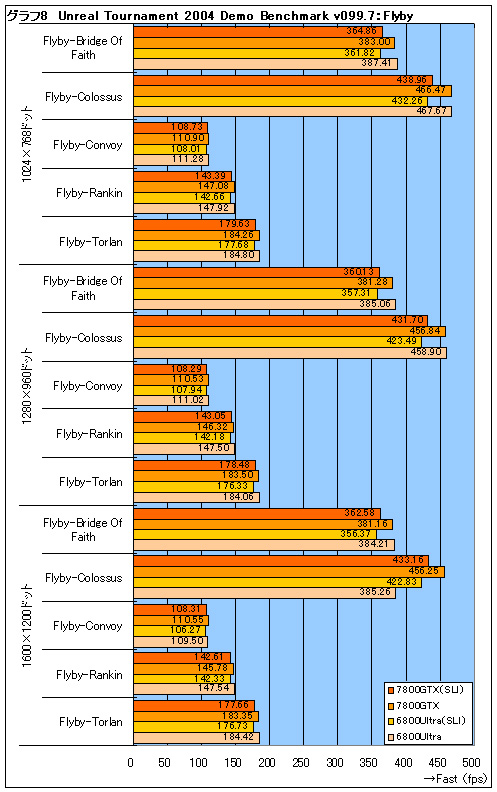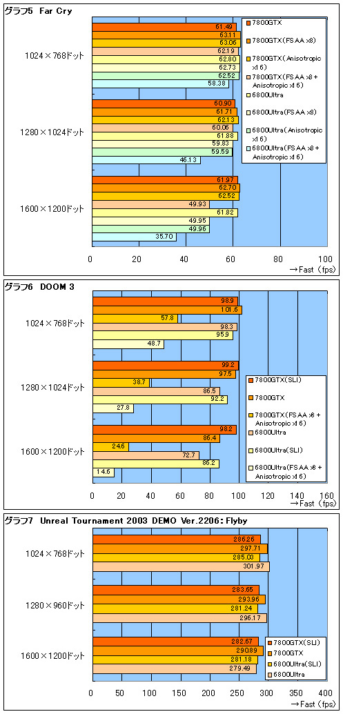 シングルカード動作における性能差について「Far Cry」のフレームレートを見てみると,6800Ultraは,高解像度でフルスクリーンアンチエイリアシング(以下FSAA)などを適用するとフレームレートが大きく低下するのに対し,7800GTXではそれほど極端な落ち込みが見られない(グラフ5)。とくに,1280×1024ドットでFSAA x8と異方性フィルタリング(Anisotoropic Filtering,以下Anisotropic)x16を適用しても,1024×768ドット時とスコアがほとんど変わらない点は賞賛に値する。 グラフ6の「DOOM 3」のフレームレートにおいても同様で,高解像度における7800GTXのパフォーマンスが非常に良好だ。フィルタリングを適用にするとさすがに数値は落ち込むが,1024×768ドットでFSAA x8とAnisotropic x16を同時に適用してもゲームになる(57.8fps)のは要注目。 純粋に解像度だけを変更してUnreal Tournament 2003およびUnreal Tournament 2004で比較してみると,ゲーム自体の負荷が軽いため,7800GTXと6800Ultraの間にあまり差はない(グラフ7,8)。マップによっては6800Ultraのほうがスコアが高い場合すらある。 つまり7800GTXは,6800Ultraよりも,さらに高い解像度環境,高度なフィルタリング適用時に,よいパフォーマンスを得られるグラフィックスチップなのだ。リファレンスカードがグラフィックスメモリ容量512MBを初めから視野に入れて設計されているあたりからも,高解像度へと進むディスプレイ市場,そしてハイエンドゲーマーのニーズに合った製品と言える。