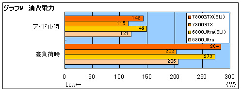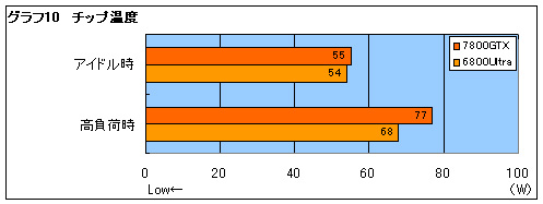 最後に7800GTXの消費電力およびチップの温度を計測してみた。Windows XP起動後30分間放置した状態をアイドル時,3DMark05 Build120を繰り返し実行している状態を高負荷時として,ワットチェッカーでシステム全体の消費電力を,そしてForceWareでチップ温度を計測している。 SLI動作時に消費電力が増加してしまうのは当然だが,それでも284Wという値はかなり大きい(グラフ9)。実際,2系統の+12Vを持つ定格420Wの電源ユニット(+12V1が20A)では,3DMark05 Build120の実行中にシステムが強制終了してしまった。7800GTXによるSLI動作を考えているなら,容量にかなりの余裕がある電源ユニットを用意する必要がありそうだ。既報(「こちら」)のとおり,AOpenは最低でも500Wが必要としているので,参考にしてほしい。 ただ,シングルカードでは,わずかながら6800Ultraより消費電力が下がっており,SLIを考慮しないのであれば,現在利用している電源ユニットを流用できる可能性が高いといえる。 また,消費電力が大きいと発熱量も増える傾向にあるが,7800GTXのチップ温度は高負荷時で77℃とかなり高い(グラフ10)。前述したとおり,冷却機構は意外にもコンパクトなサイズにまとめられているわけだが,リファレンスカードのチップクーラーは冷却能力が足りていない印象を受けた。GeForce FX 5800以降,そこかしこから「うるさい」と言われ続けてきたことに対する反動なのか,確かにクーラーは静かになった印象を受けるが,正直これでは心許ない。熱暴走こそしなかったものの,これからの季節を考えると少し不安が残る。