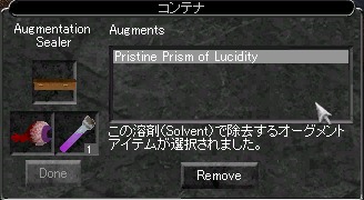 ■オーグメントを外す おそらく,大半の人がいちばん楽しみにしていたのがこのフィーチャーだろう。装備に取り付けた強化パーツ「オーグメント」を破壊せずに取り外せるようになった。 取り外しには,BBMのLDoNキャンプにいるNPC,Minzit Furnovからオーグを外す溶剤「Distiller」を買わなければならない。Distillerにはクラス1〜18までの種類があり,オーグメントの詳細を見て,新しくアイテム情報として加わった個所を読んでオーグにあった溶剤を買って,水盤のSealerでコンバインしなくてはならない。 溶剤の値段は,
