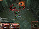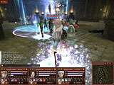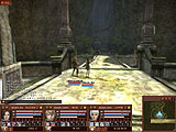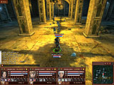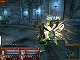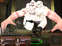 GEは比較的マップの見通しが良く,キャラクターに対してカメラ位置をかなり"引ける"ため,移動に関するストレスは少なめだ。もちろんこれには,Path Findingエンジン(自動経路選択エンジン)も大きく貢献しており,開けたフィールドでは遠くの移動ポイントをクリックしておいて他人とチャットしたり一服するぐらいのことはできる。 一方屋内(今回試せたのはダンジョン)など,前後左右に壁のあるようなシチュエーションでは,キャラクターの視認性を高めるためにキャラクター移動とカメラ操作を同時に行う必要がある。そしてここに,3Dゲーム特有のストレスがあった。 これは屋内マップのすべての場所にいえることではないが,キャラクターとカメラの間に"透けない壁"があるのがストレスの大きな原因で,四角い部屋の隅っこで戦闘を行う場合などはやや煩雑な操作となるうえ,スキル使用やモンスターターゲットなどの行動がワンテンポ遅れてしまう印象だ。もちろんこれは3Dゲームでは比較的ポピュラーな問題(?)で"気にしなければ気にならない"のだが,GEの場合はAIによって複数のキャラクターがある程度自立して行動するため,弊害が顕著に出てしまっている。ここはぜひ改善を求めたいところである。