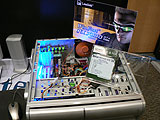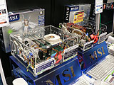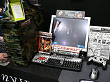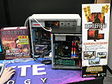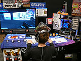 どのメーカーも,"最強マシン"を謳い,アクリルの透明ケースで覆ったGeForce 7800 GTX搭載PCを展示。もちろんハードウェアの性能を最大限に生かすため,2枚のグラフィックスカードで処理を分担して高速な描画を実現する「SLI」を用いた構成が,大半を占める。チップ構成は同じでも,マザーボードやグラフィックスカードの種類によって,取り回しの違い,ファン形状による配置の違い,また排熱機構や静音性能の違いなど,細かく特徴が異なる。来場者も筋金入りのハードウェアマニアが多いらしく,メーカーの説明員からNVIDIA担当者までを引っ張り回して,熱心に質問を重ねていた。