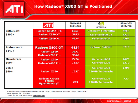 Radeon X800 GTは,Radeon X800シリーズ最下位に位置するグラフィックスチップで,Radeon X800 XLが16ピクセルパイプライン,Radeon X800やRadeon X800 Proが12ピクセルパイプライン構成なのに対し,8ピクセルパイプライン構成となる。最下位モデルが「GT」というあたりには,かつてNVIDIAに「XT」を下位モデルで使われたATIによる意趣返しの意味が含まれていそうだが,いずれにせよATIは,Radeon X800 GTをGeForce 6600やGeForce 6600 GTの対抗として明確に位置づけている。