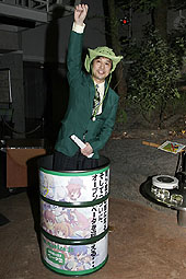 巨大なECO缶から飛び出したガンホー小島氏。緑色がイメージカラーの本作とよくマッチ(?)している