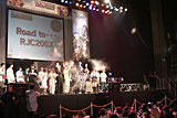 写真下段中:一回戦終了後,13時過ぎから開始された「スペシャルコスプレステージ」で壇上に集結した,コスプレイヤーのみなさん。さすがにこの数は壮観である