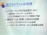 サービス開始時点での想定スペックを固めるに当たって,氏がもう一つ強調したのは,インテルやNVIDIA,主要ノートPCメーカーとの協力関係だ。開発中の新製品やリファレンスマザーボードを借りて検証するに当たっては「信長の野望 Online」で培った関係が重要な役割を果たしたという。