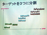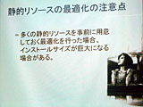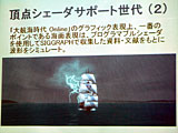 そして,可能ならば複数のソリューションによる描画コードを用意するのが望ましいこと,プログラムの実行ステップ数をぎりぎりまで減らすより,全体の構造やデータの形を見直したほうが大きな効果を見込めること,システムの大幅なアップグレードは,動作条件を考える限りあまり現実的でないことなどを(開発者向けの講演の)まとめとして述べた。