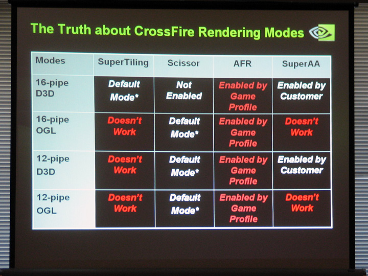 右に掲載したスライドは「CrossFireの動作モードが必ずしもすべてのCrossFire対応Radeonで有効になるわけではない」ことを示したもので,NVIDIAが調査した結果とのことだ。CrossFireの動作モード一つ一つについては「こちら」の記事に詳しいので繰り返さないが,このスライドによれば,16ピクセルパイプラインを搭載するRadeon X800 XL以上の製品では標準の動作モードとなるSuperTilingモードが,12ピクセルパイプ版Radeonでは有効にならない。OpenGL対応ゲームだと,16ピクセルパイプライン版であっても有効にならないようだ。